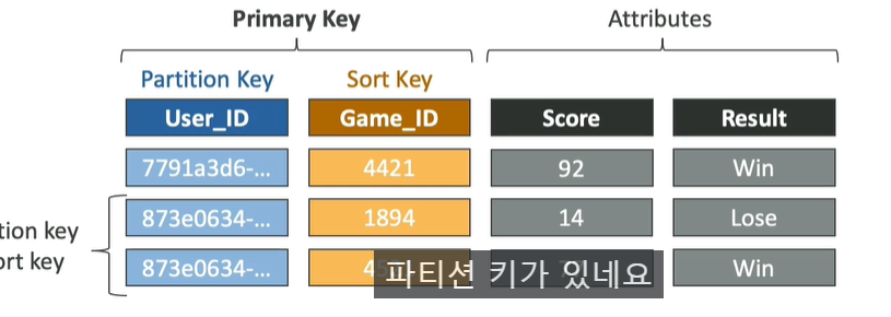 파티션키에 의해 데이터가 그룹화됨 (동일한 partition Key 가능)