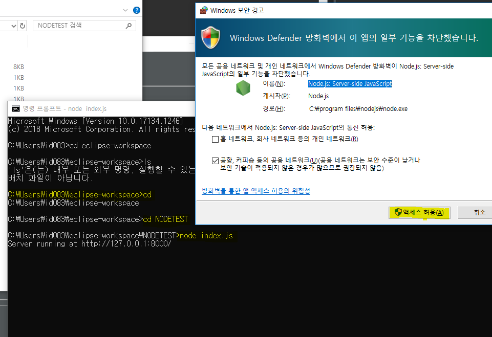 찾은 뒤 node index.js 명령어 입력 후 액세스 허용 눌러준다.