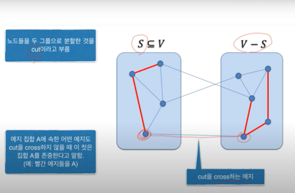 -에지 (u, v)에 대해서 u < S이고, v < V-S일 때 에지 (u, v)는 컷 (S, V-S)를 cross한다고 말합니다.