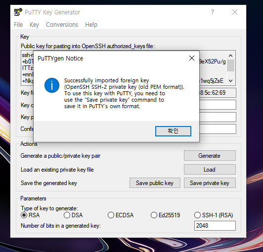 2) 확인 클릭 Save pirvate key 클릭 통해 ppk 파일 생성 저장