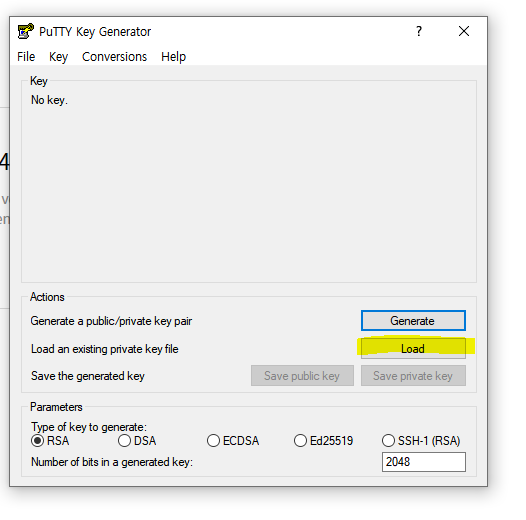 1)Load 버튼을 눌러서 PPK 로 변환할 PEM 파일을 로드해온다.